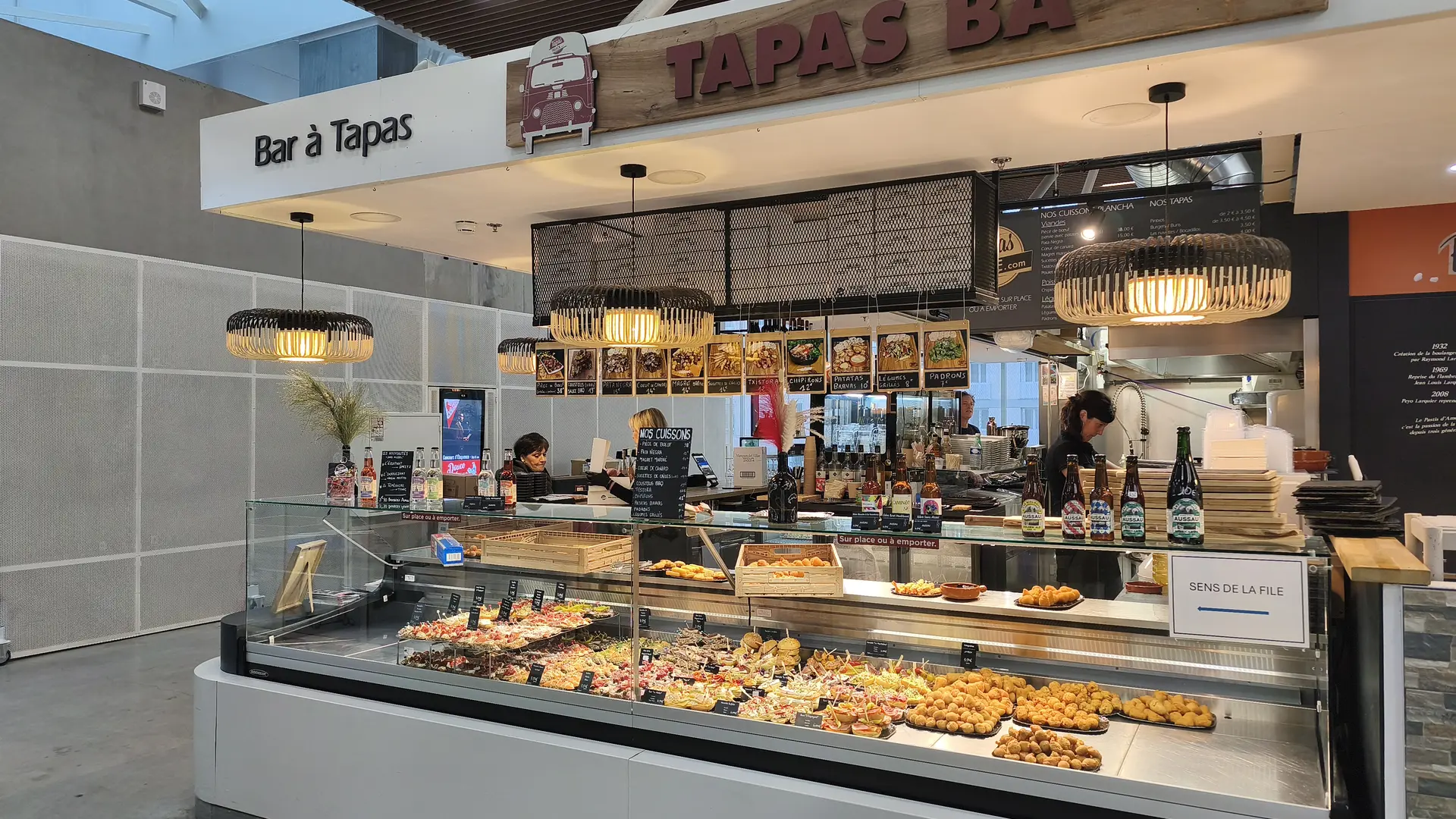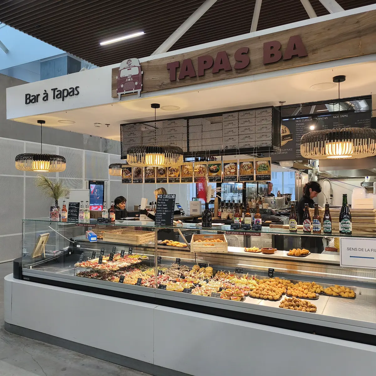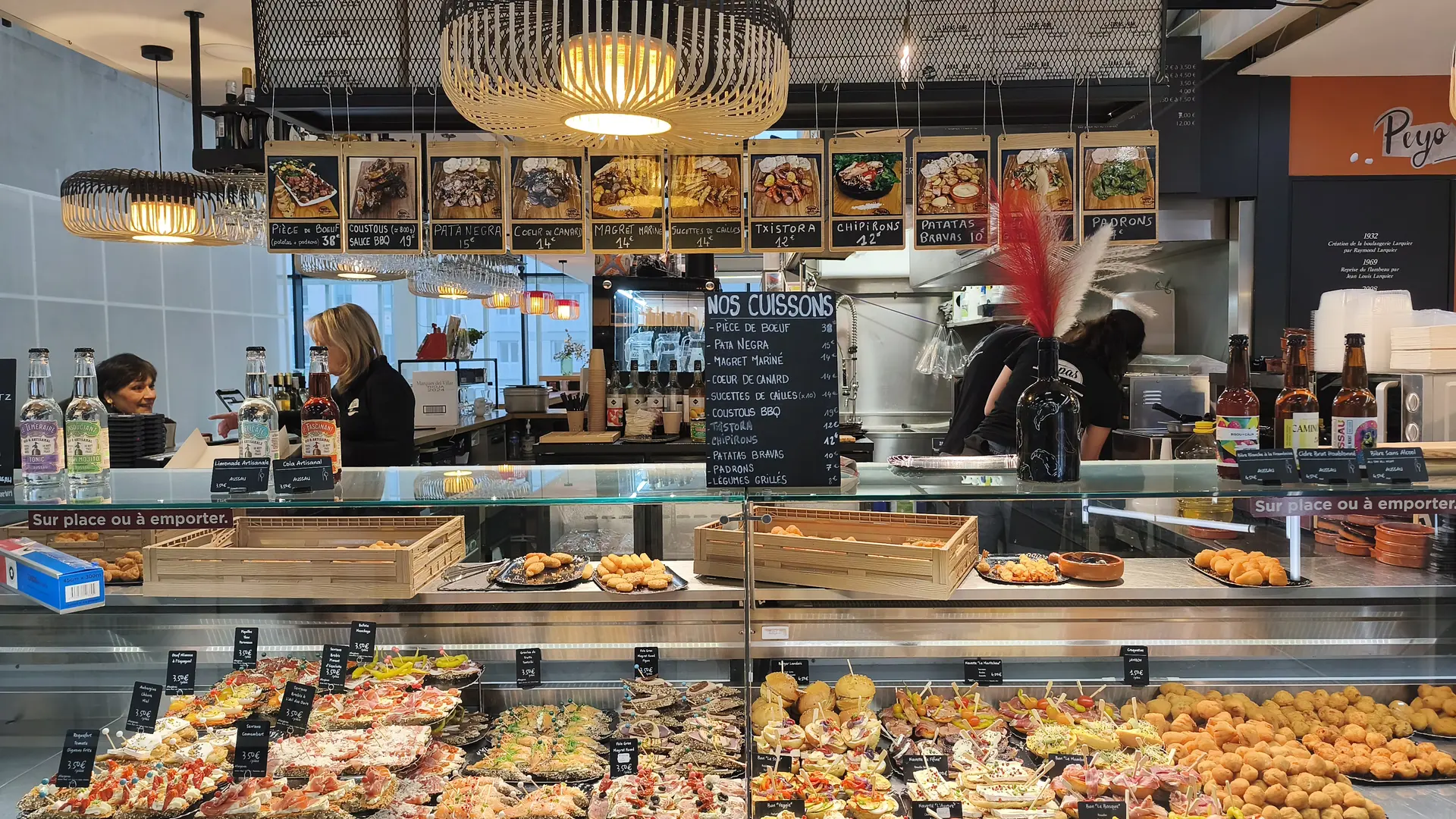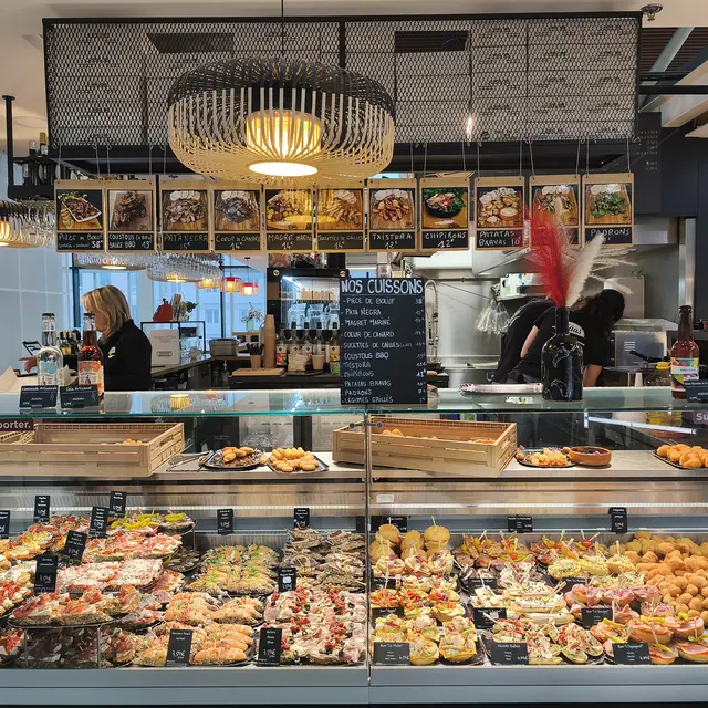 The menu features a wide range of pintxos, with over 60 options to choose from to eat in or take away. The recipes evolve regularly, with new items added every month, and handcrafted products produced on site or in the workshop. The identity is clearly oriented towards Spain, through a selection of emblematic products: Ibérico pork, Pata Negra, txistorra de Navarre and pimientos de Padron. Fattened duck from the Landes region also finds its place, notably in duck heart, alongside patatas bravas and croquetas. To accompany the dishes, a selection of wines, beers and soft drinks completes the offer, in a simple and convivial spirit, true to the atmosphere of Les Halles