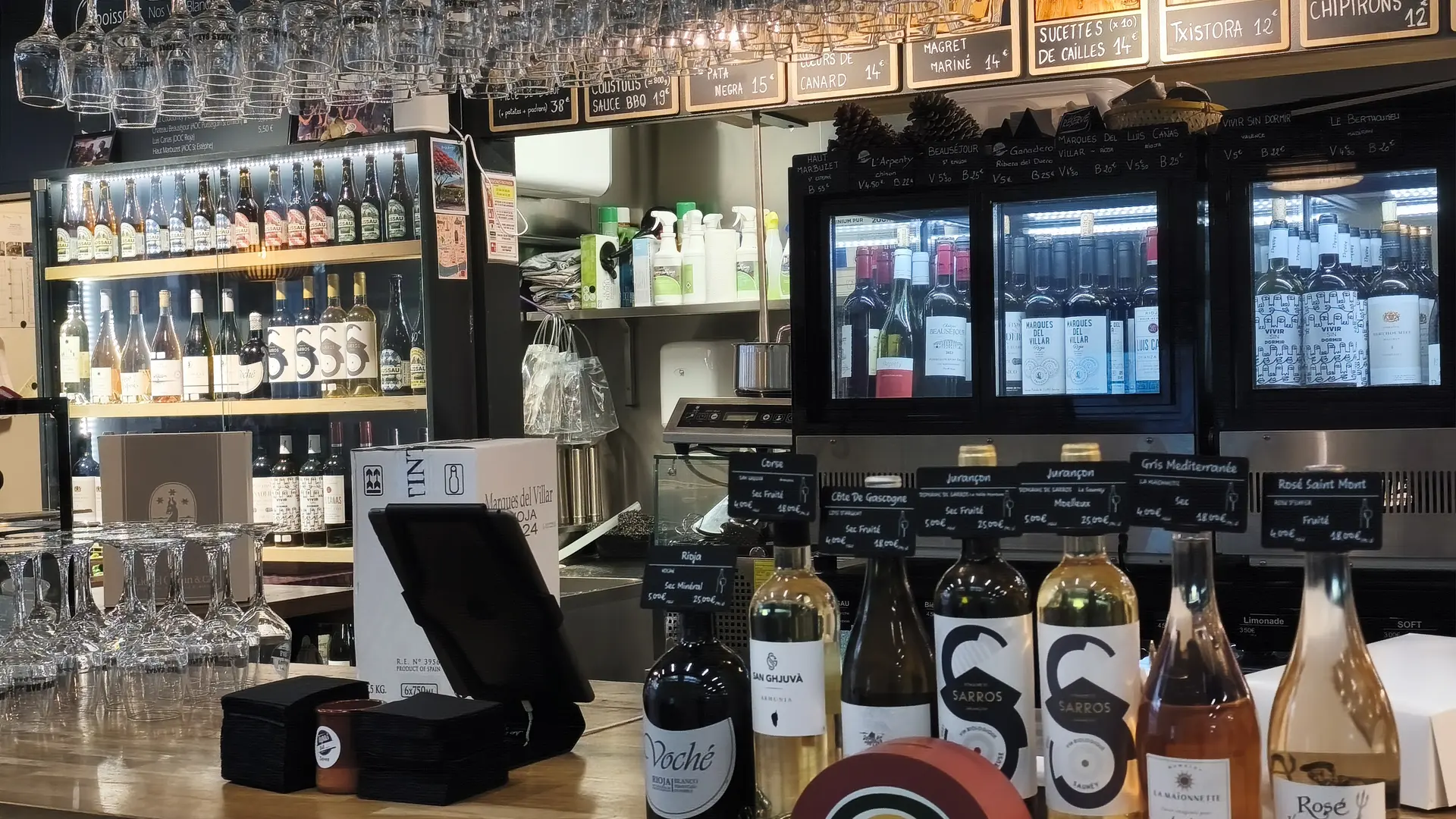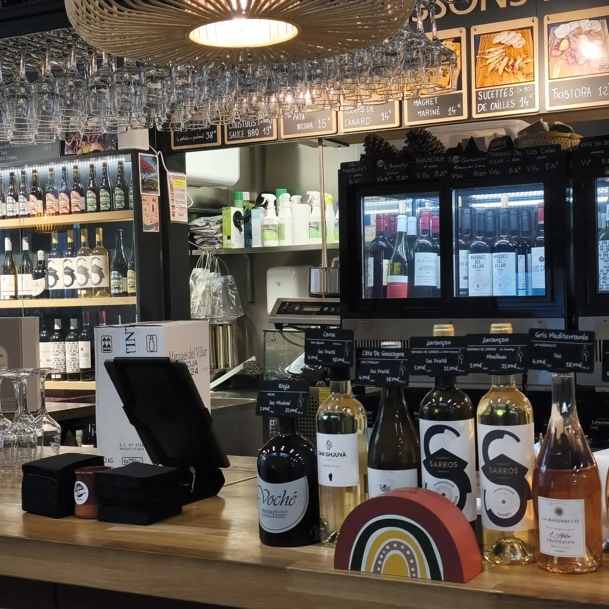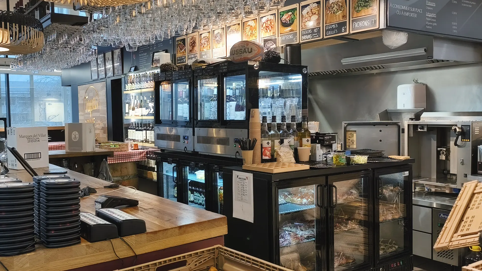 The menu features a wide range of pintxos, with over 60 options to choose from to eat in or take away. The recipes evolve regularly, with new items added every month, and handcrafted products produced on site or in the workshop. The identity is clearly oriented towards Spain, through a selection of emblematic products: Ibérico pork, Pata Negra, txistorra de Navarre and pimientos de Padron. Fattened duck from the Landes region also finds its place, notably in duck heart, alongside patatas bravas and croquetas. To accompany the dishes, a selection of wines, beers and soft drinks completes the offer, in a simple and convivial spirit, true to the atmosphere of Les Halles